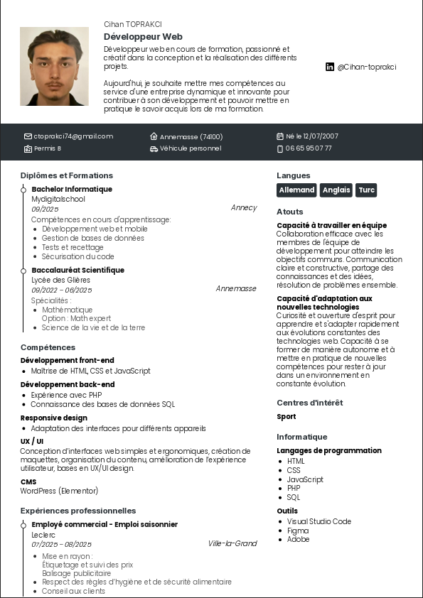 Actuellement en première année de Bachelor en Développement Web, je consacre une énergie soutenue à l'apprentissage de la programmation informatique. Ce qui m'anime particulièrement est la capacité de donner vie à des pages vides pour en faire des outils interactifs, opérationnels et à forte valeur ajoutée.